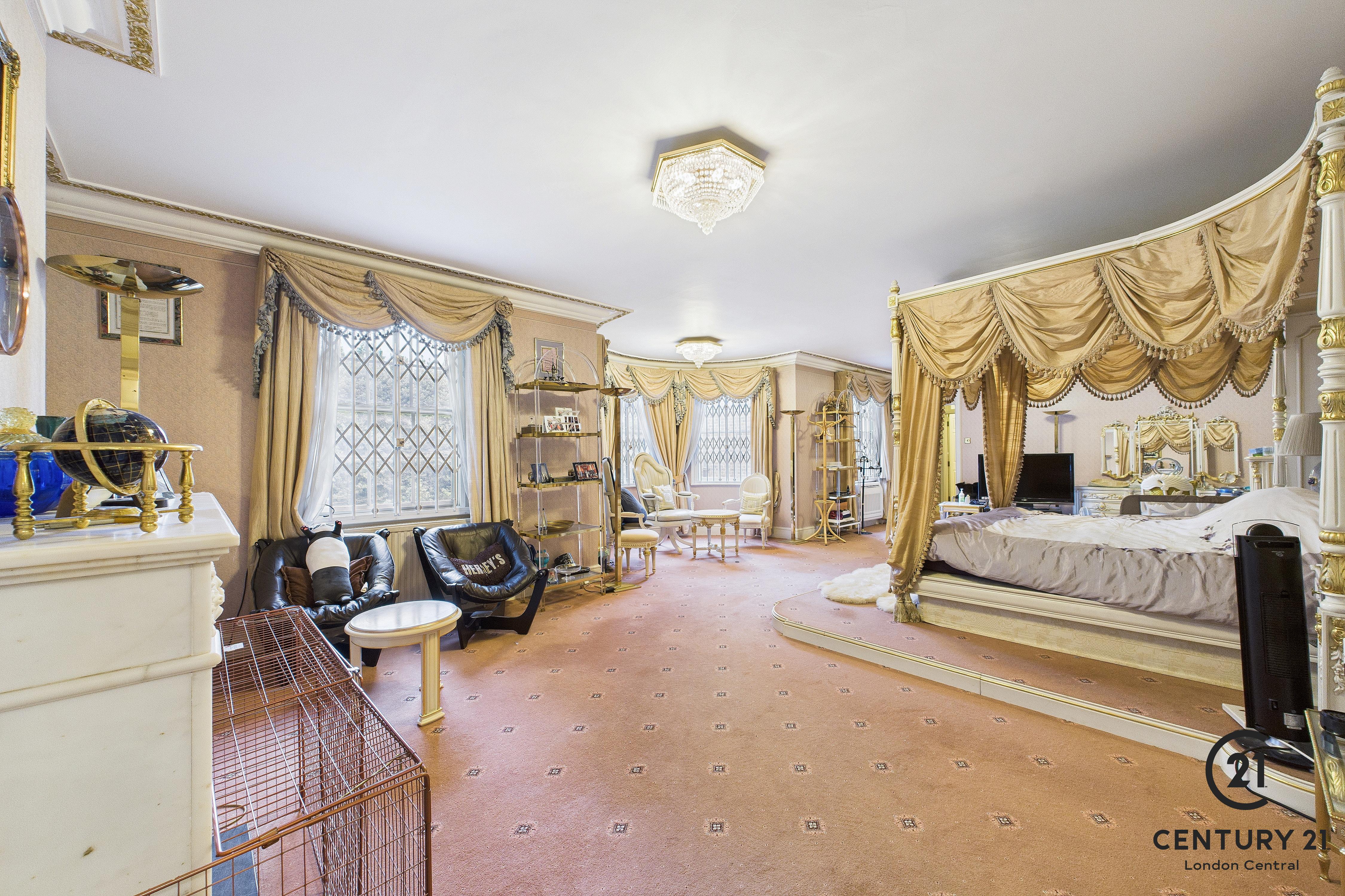 This substantial residence opens into a wide hallway leading into a formal reception room adorned with ornate chandeliers, decorative cornicing, and plush interiors. A second reception space provides additional flexibility for entertaining or relaxing. The large formal dining room is ideal for hosting and is complemented by a generous, fully fitted kitchen with ample cabinetry and workspace. Spread across the upper floors are eleven bedrooms, including a magnificent principal suite with a walk-in wardrobe. The property also includes nine bathrooms and extensive built-in storage throughout.