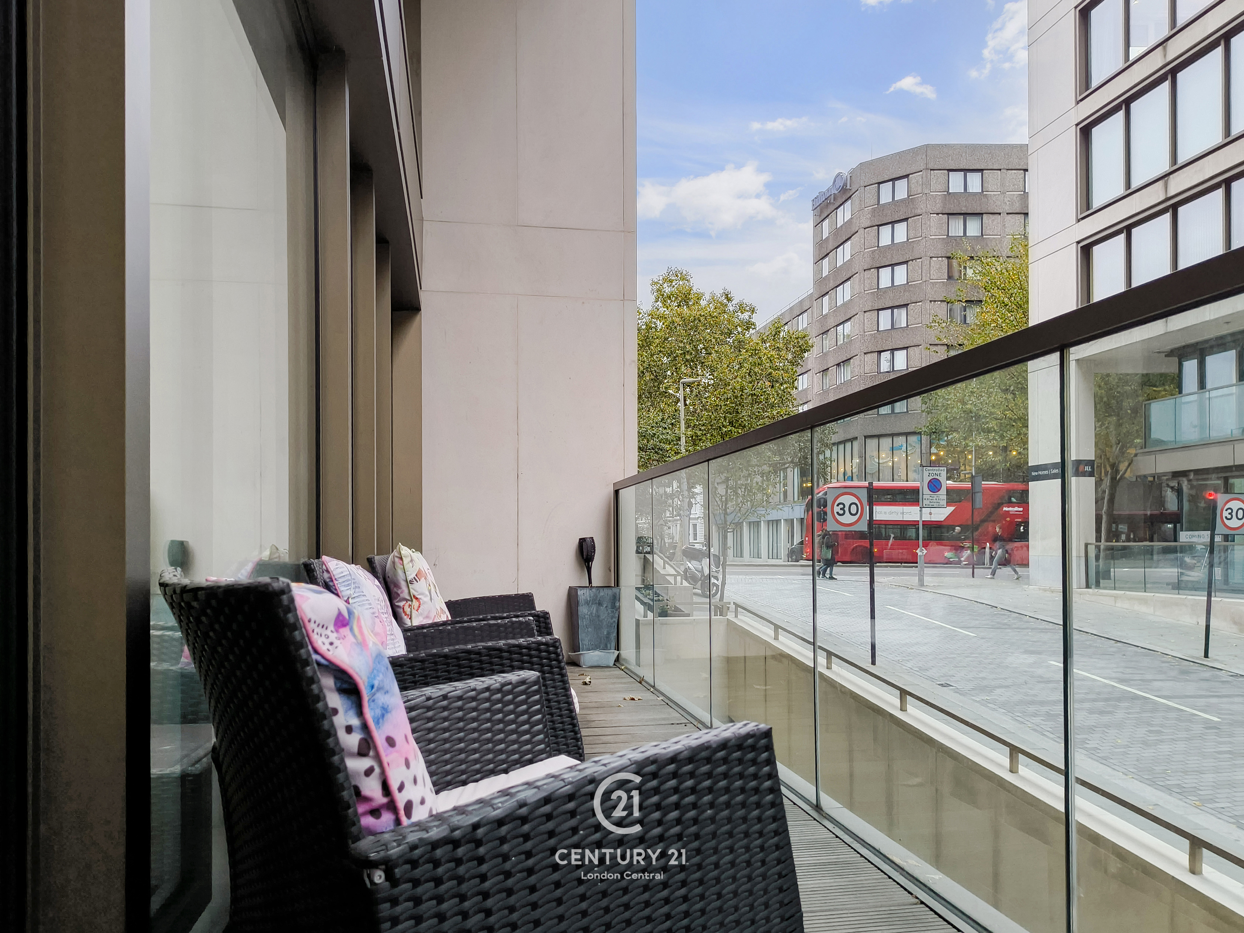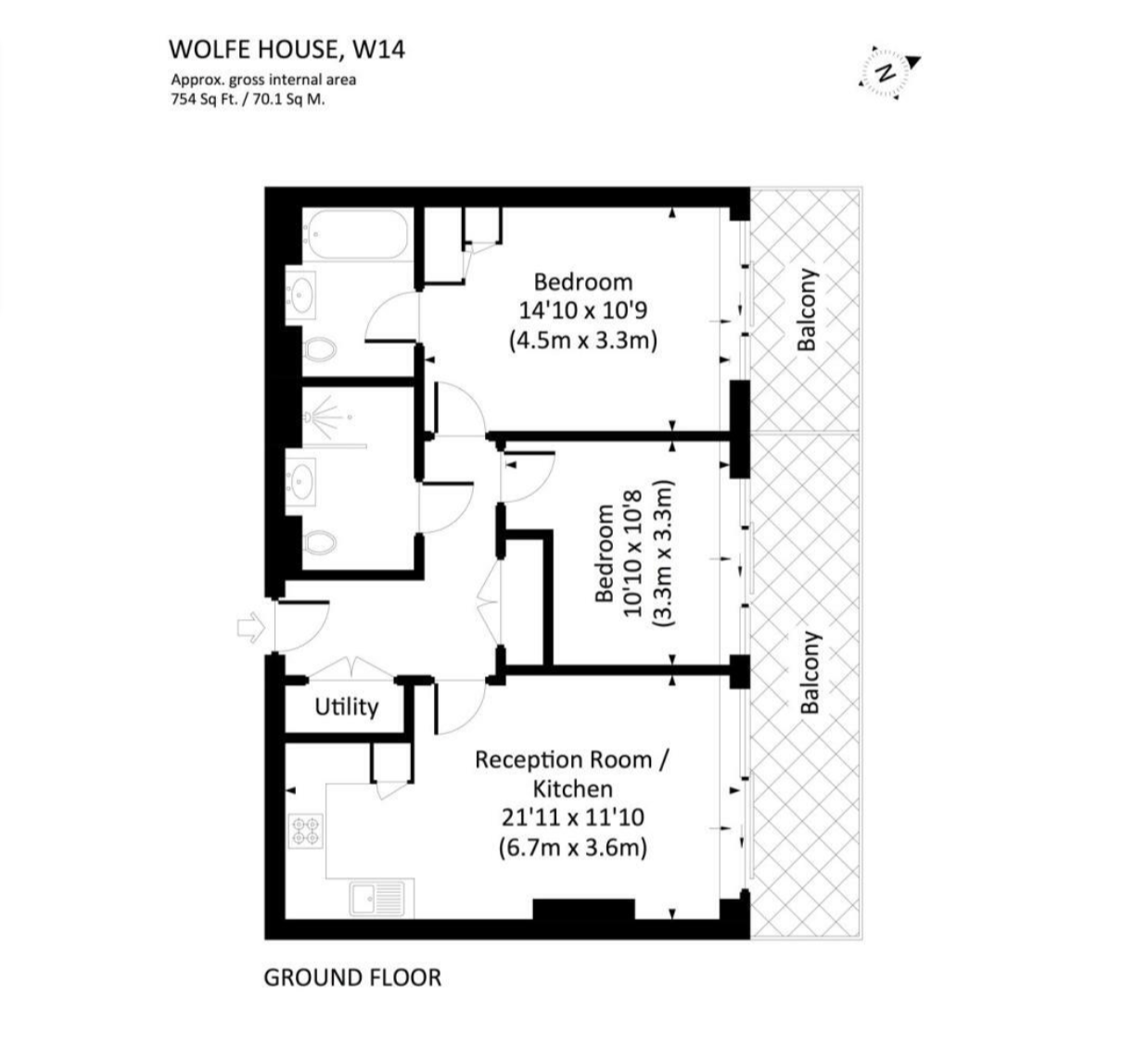 A beautifully refurbished two-bedroom, two-bathroom flat of 754 sq ft in Wolfe House on High Street Kensington (W14). Located on the ground floor, the apartment features a spacious open-plan kitchen and living area with wooden flooring throughout, plus two private balconies. The master bedroom is en-suite with a bathtub, and there is a second bathroom with a walk-in shower.